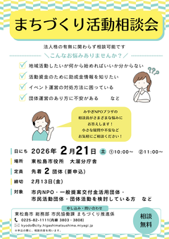 本市では、市民を対象とした地域課題の解決などを目指すまちづくり活動事業に対し、支援を行っています。市内のNPO、市民活動団体のよりよい活動促進を目的に、みやぎNPOプラザによる資金調達、団体運営等に関する相談会を開催します。