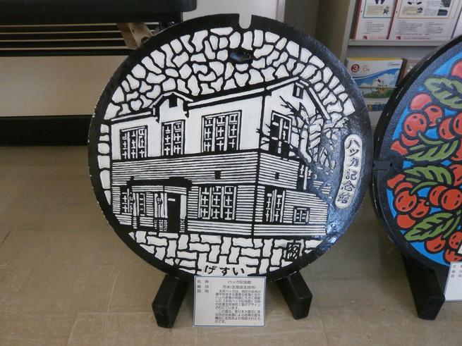本市と友好都市である山形県東根市及び、交流のある北海道北見市より寄贈されたデザインマンホール蓋を下水道課(市役所鳴瀬庁舎2階)前に展示しております。
