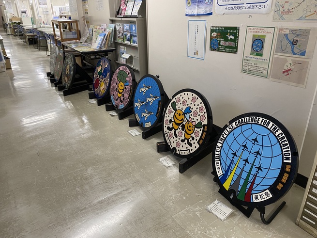 マンホールカードにも採用されている、「イート・イ~ナ」、「ブルーインパルス」をはじめ、東松島市内各所に設置されているデザインマンホール蓋を常時展示しております。