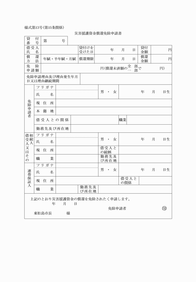 第15条 災害援護資金の償還未済額の全部又は一部の償還の免除を受けようとする者(以下「償還免除申請者」という。)は、その理由その他市長が必要と認める事項を記載した災害援護資金償還免除申請書(様式第13号)を、市長に提出しなければならない。