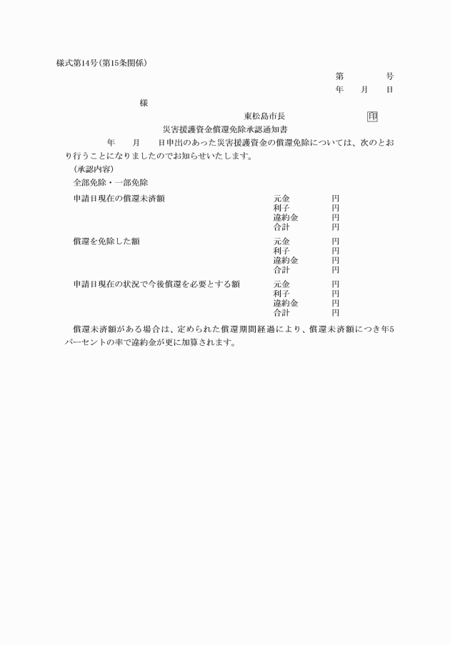 3 市長は、償還の免除を認めたときは、災害援護資金償還免除承認通知書(様式第14号)を、当該償還免除申請者に交付するものとする。