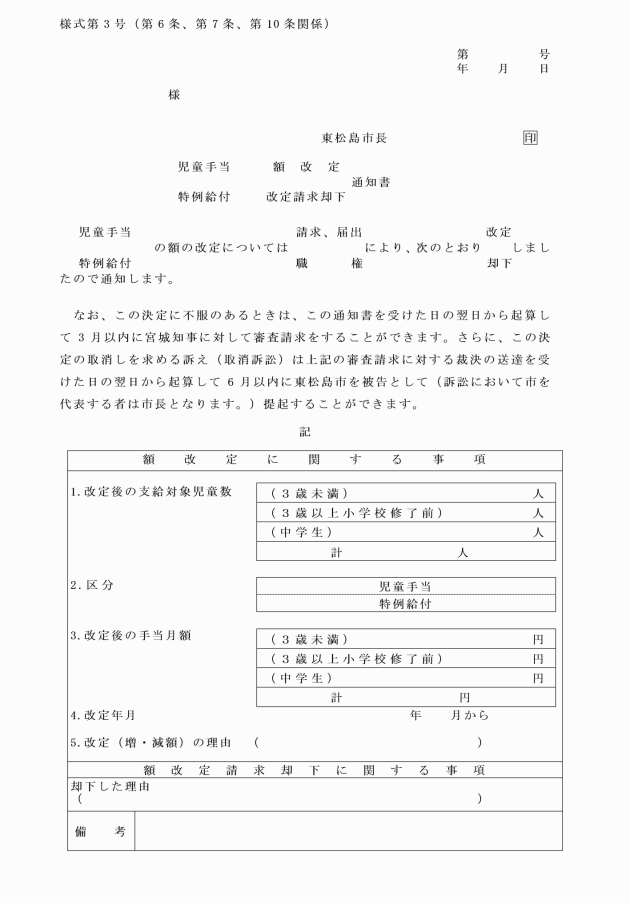 第7条 市長は、省令第3条第1項の規定による額改定届の提出を受けたときは、その内容を審査し、手当額の可否について、様式第3号を用いて、届出者へ通知するものとする。