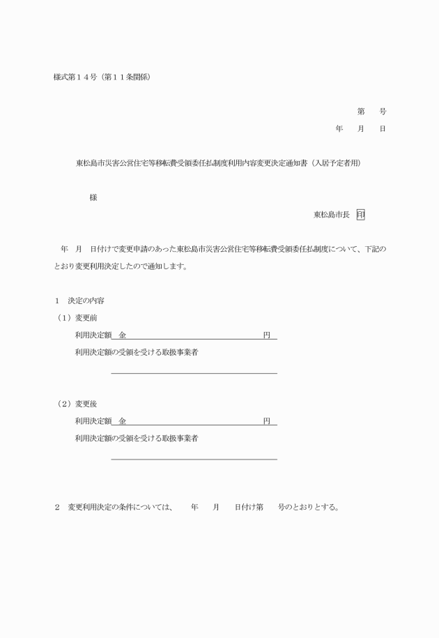 (2) 移転事業の内容のうち利用申請額又は取扱事業者を変更するとき 東松島市災害公営住宅等移転費受領委任払制度利用内容変更申請書(様式第13号)及び変更内容が確認できる書類の写し