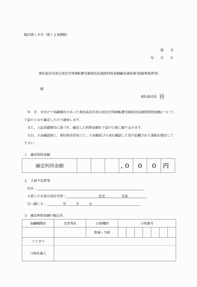 2 取扱事業者は、引っ越し事業を廃止、休止、又は再開するとき若しくは登録を辞退するときは、速やかに東松島市災害公営住宅等移転費受領委任払取扱事業者廃止・休止・再開・辞退届出書(様式第5号)により市長に届け出なければならない。